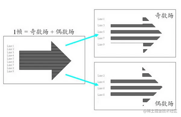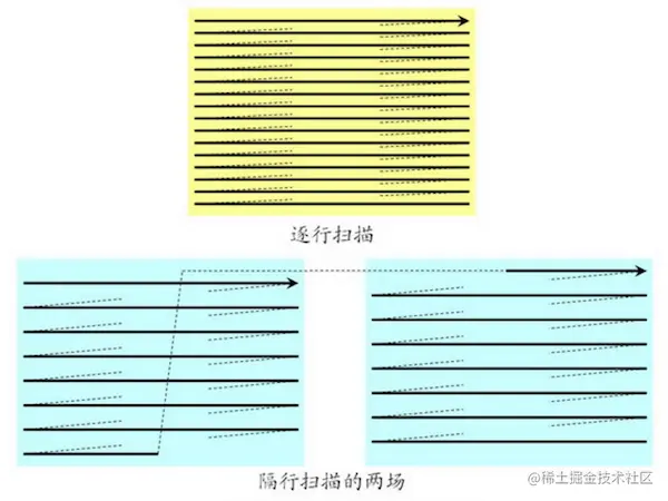 - 隔行扫描:扫描下来的一帧图像就被分为了两个部分,这每一部分就称为「场」,根据次序分为:「顶场」和「底场」.适合于非运动图像