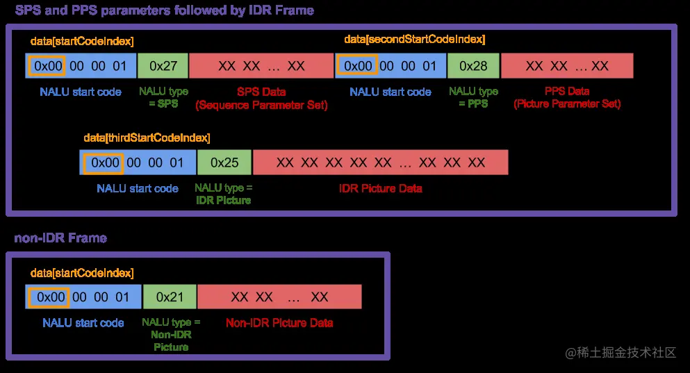 例如,这个 NALULengthSizeMinusOne 是 3,那么每个 NALU 前面前缀的长度就是 4 个字节。我们在读取后续数据时,可以先读 4 个字节,然后把这四个字节转成整数,就是这个 NALU 的长度了,注意,这个长度并不包含起始的4个字节,是单纯 NALU 的长度。