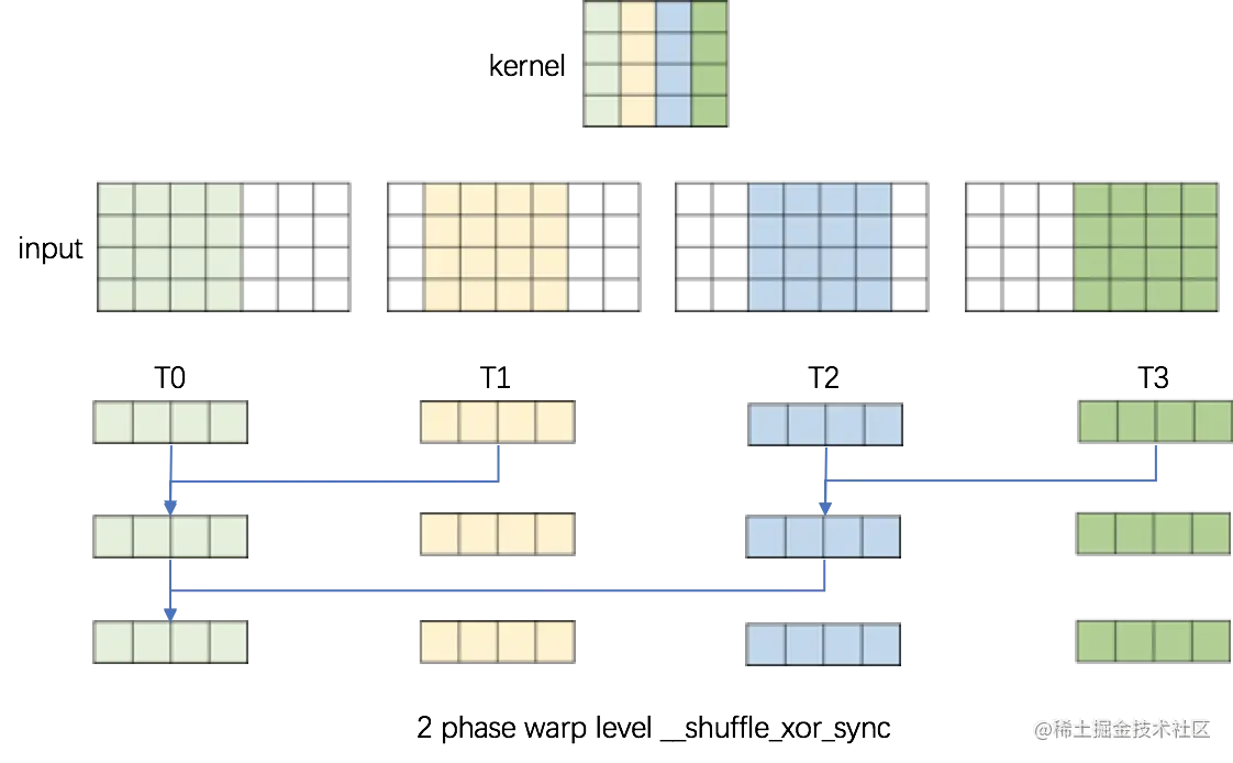 由于对 kernel 做了分块,所以每行的 4 个线程计算完毕之后每个 Thread 持有的是 output 的部分和,需要将 4 个线程各自的结果规约到一起才是最终结果。此处借助了 Warp Shuffle API__shuffle_xor_sync,它实现了一种蝶形规约,其原理如下图所示。由于只需要将每 4 个线程的结果规约到一起就行了,所以只需要进行 2 次 __shuffle_xor_sync 即可,最后将 outupt 写回。