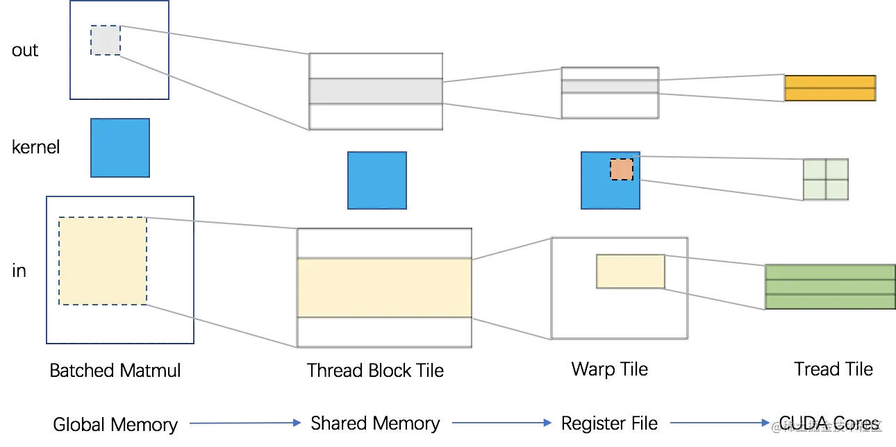 在 GEMM 的计算过程中,根据 m, n 和 k 三个维度下标可以推导出数据在卷积的输入输出以及 kernel 中的下标。所以可以将 im2col 和 GEMM 两个过程融合在一起从而达到降低显存占用和性能加速的效果,这其实就是 Implicit GEMM 的原理。本文不过多介绍,感兴趣的可以阅读之前的技术文章。