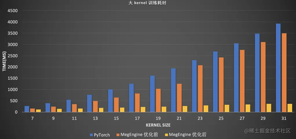 为了衡量算子的优劣,前面的实验都是从算子绝对性能和硬件理论峰值相比的角度设计的。为了让用户有更直观的感受,我们同样测试了大 kernel depthwise 卷积的运行时间。实验环境为 2080Ti @ cuda10.1 + cudnn7.6.3,所用的数据类型为 fp32, batch size 为 64,channel 为 384,用 24 个 layer 进行前向和反向计算。从下图可见 MegEngine 比 PyTorch(with cudnn) 最高快 10 倍以上,优化后的 MegEngine 在 31×31 的 kernel size 上和 PyTorch 9×9 的训练时间相当。