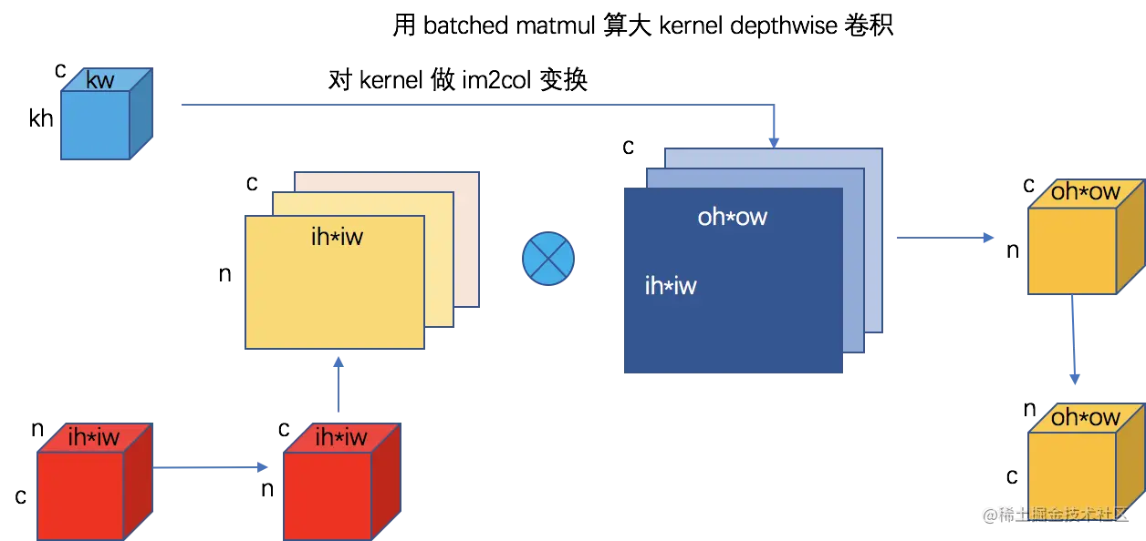 回想一下 dense 卷积用 kernel 去卷 input,对 input 做 im2col 变换。现在大 kernel depthwise 卷积用 input 去卷 kernel,所以此时应该对 kernel 做 im2col 变换。算法过程没有本质区别,只需要在 im2col 中将 kernel 看做 input,将 input 看做 kernel 即可。由于 depthwise 卷积是逐通道做卷积的,因此 im2col 变换也需要逐通道做。如下图所示,每个通道变换之后都会产生一个 M = n, N = oh*ow, K = ih*iw 的 GEMM。根据上一篇文章的分析,Batched GEMM 相比于 Batched GEMV 更容易打满硬件设备的浮点计算峰值。