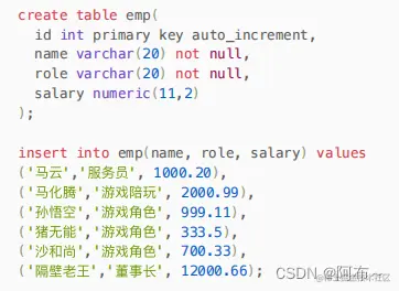 准备测试表及数据:职员表,有id(主键)、name(姓名)、role(⻆⾊)、salary(薪⽔)