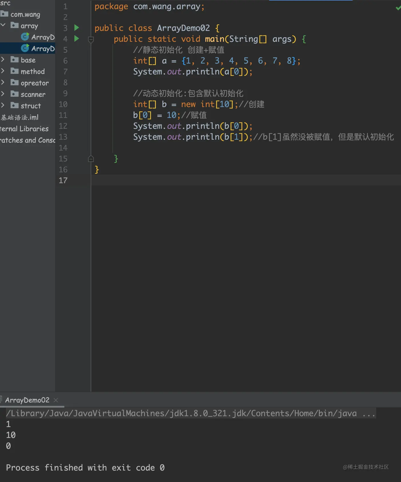 数组是引用类型,它的元素相当于类的实例变量,因此数组一经分配空间,其中的每个元素也被按照实例变量同样的方式被隐式初始化。