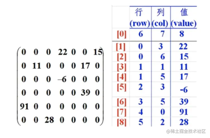 - 如下图,左边是原始数组,右边是稀疏数组