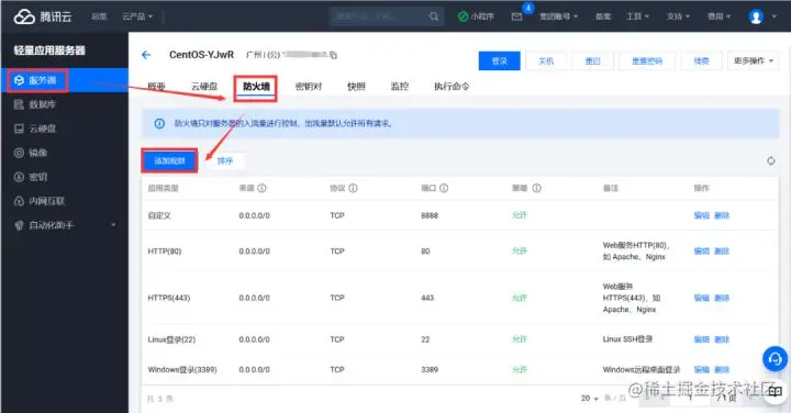 登录服务器,进入控制台,找到服务器--防火墙--添加规则