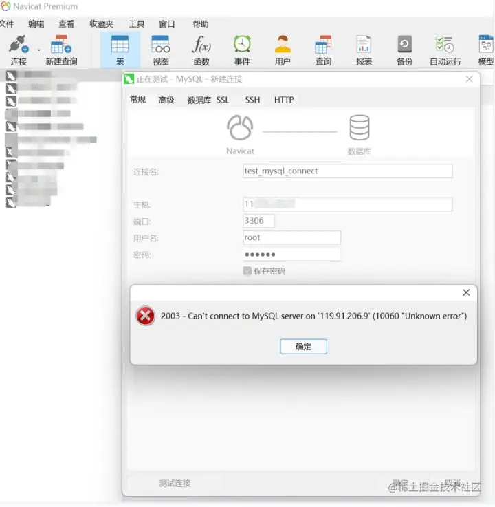 ● **例如:**我在腾讯云服务器部署了一个 MySQL 的服务,MySQL 启动成功后,在 windows 下的 navicat 连接不了?记起来在云服务器没有开放端口,所以就会导致以上连接不成功的问题,**所以解决此问题的方法就是在云服务器上去开启对应的端口;**如果开启了端口后还是不能访问的,可以尝试在开启端口后重启一下服务器。