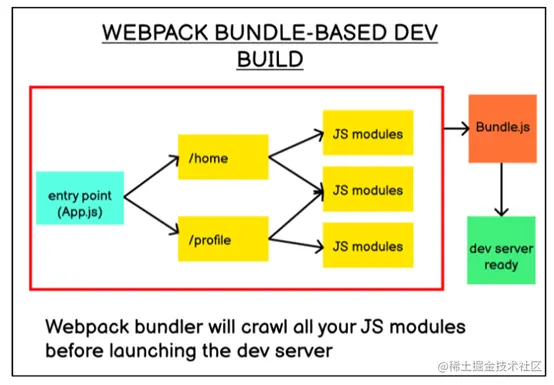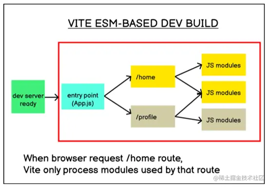 虽然基于捆绑程序的工作流(如Webpack)必须在单个浏览器请求之前处理整个JavaScript模块,但Vite仅在单个浏览器请求之前处理依赖模块。