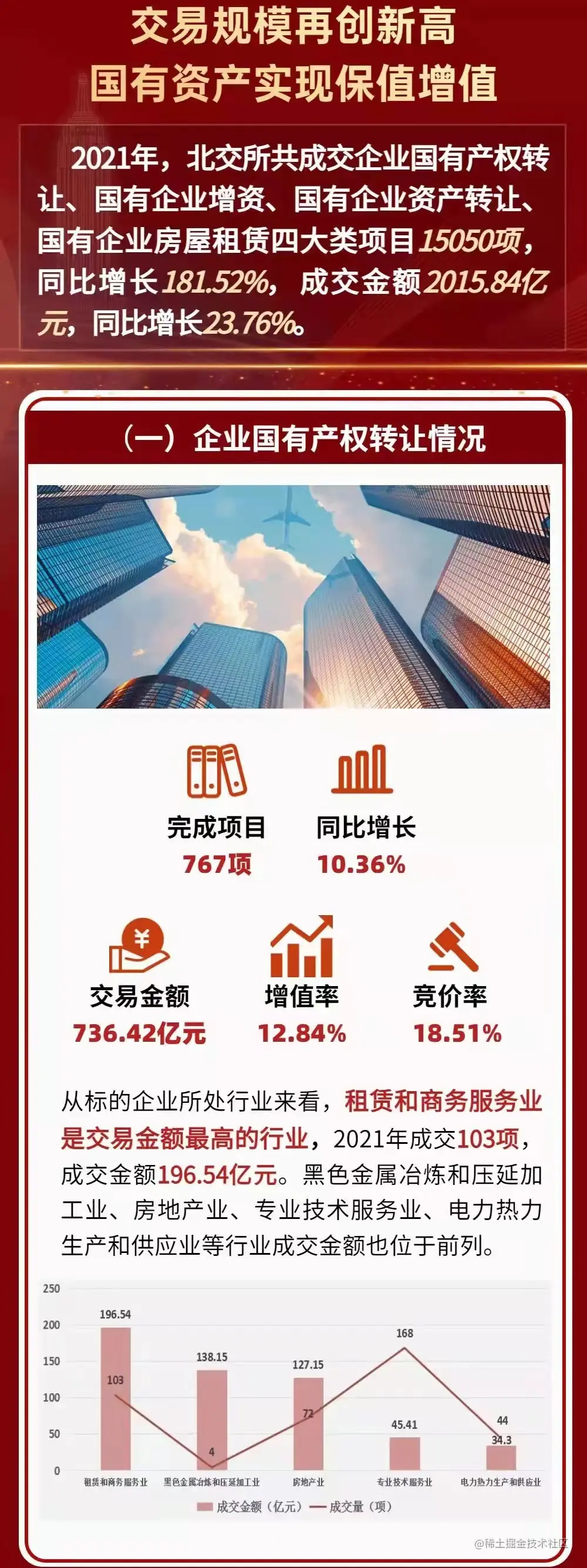 2022年是“十四五”奠基之年,同时也是国企改革三年行动决战决胜之年。日前,国务院国有企业改革领导小组办公室公布了440家科改示范企业名单,并对整体的改革工作提出了更高的要求。以“建设规范”、高效的新型资本市场”和“服务国家战略和首都城市功能建设”两条工作为主线的北京产权交易所集团,我们将与贵司一道为国资国企改革助力,为实体经济高质量发展赋能。为了能够提供更好的服务,我们为您整理了北交所简介和2021年度产权交易的相关业绩。后续也将定期为提供专业的产权交易信息资讯,如有任何问题,可上塔米狗平台,搜索北交所西南频道联系我们的服务达人。