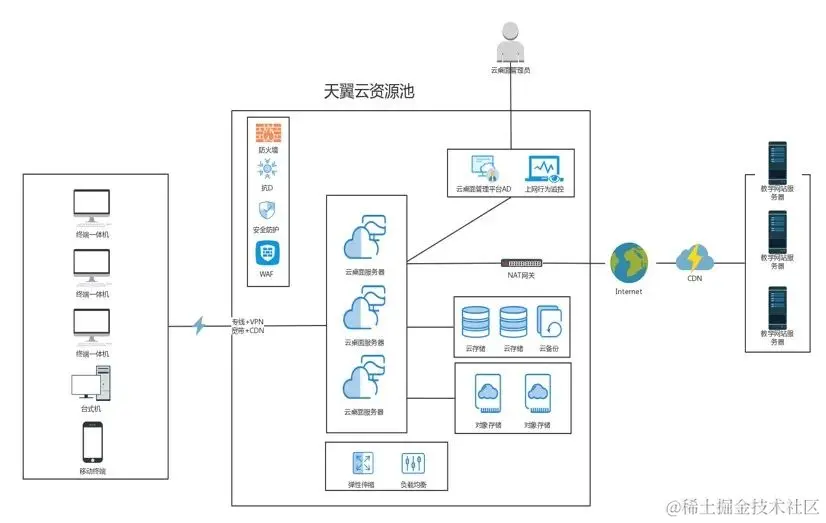 针对近期中小企业复工复产员工远程办公的需求,天翼云整理了一整套云桌面办公场景的解决方案,通过将云桌面、云存储、NAT网关、云安全等多项产品结合起来,为中小企业提供一站式云桌面服务。