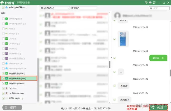 没有做过备份的小伙伴们微信的聊天记录删除了还能恢复吗?当然可以,并且成功的概率是非常大的。这里小编推荐大家去使用专业的数据软件进行聊天记录的恢复,专业的数据软件能够很好的对你的手机进行全盘数据扫描。当数据蛙苹果恢复专家软件扫描完成以后,我们则可以在扫描出来的数据里查看到自己删除了的微信聊天记录,然后再进行选择性的恢复。