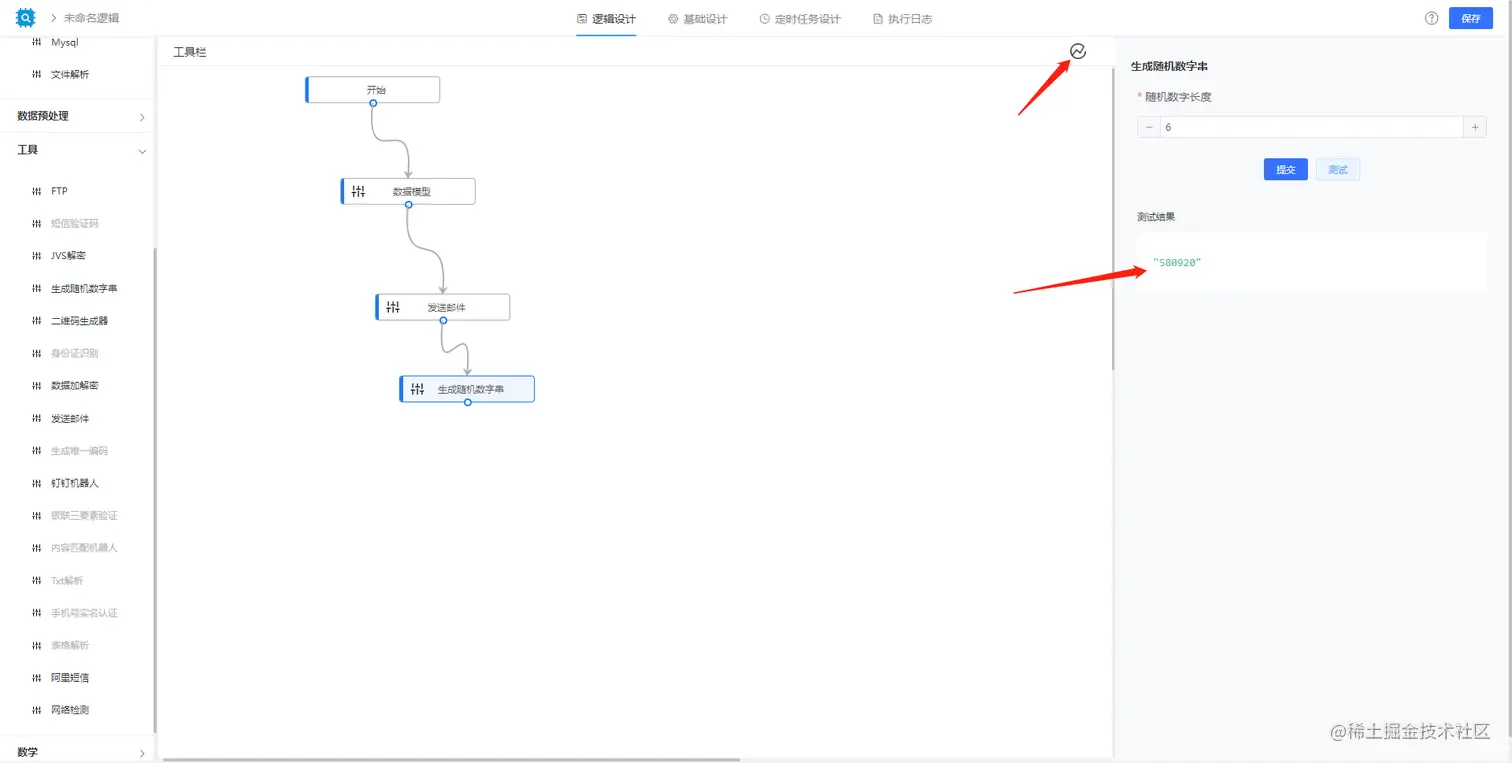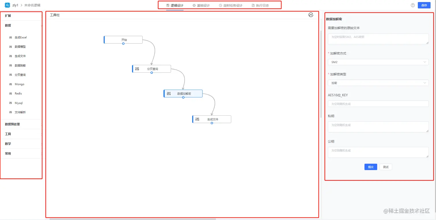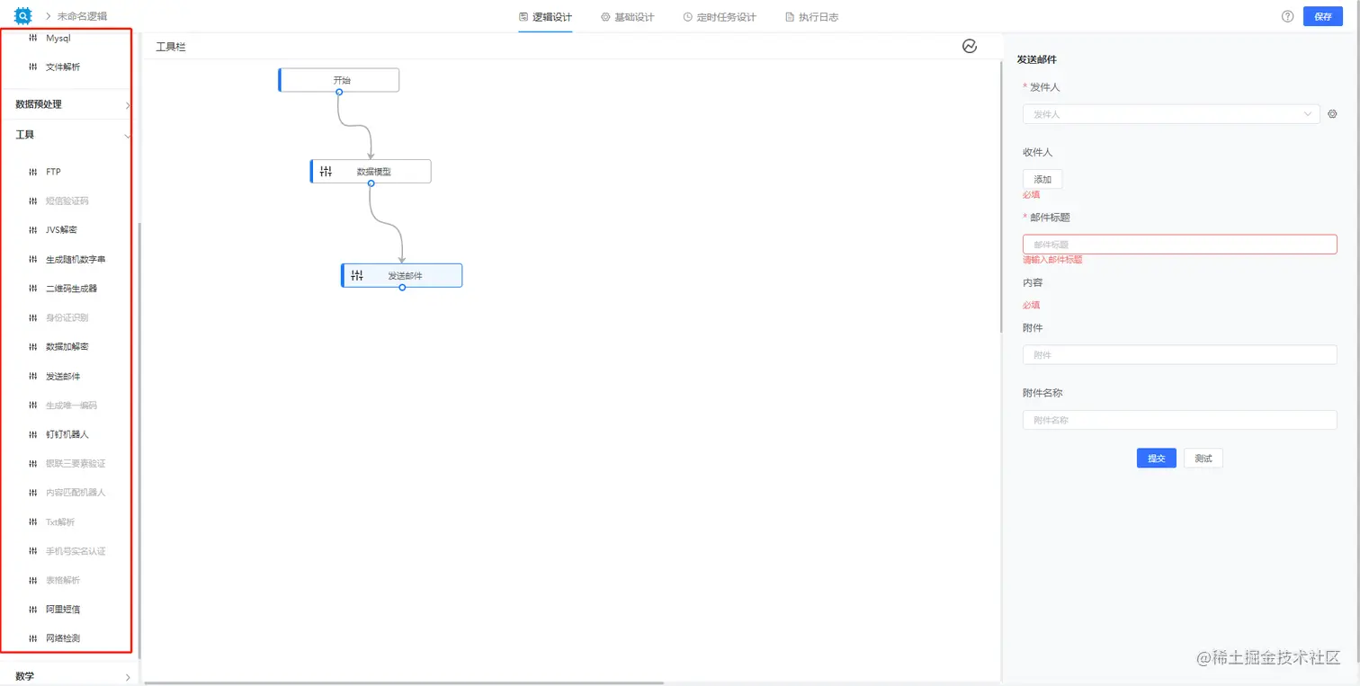 通过拖拽化将左侧的原子功能拖拽到逻辑画布中,通过线条串联业务,在右侧的属性配置界面设置节点执行相关参数,从而形成逻辑