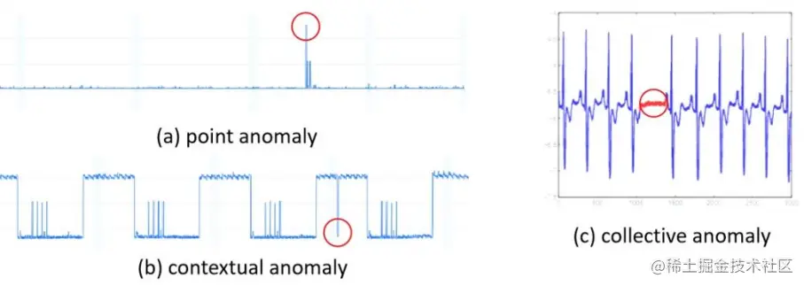 运维领域中的 时间 序列异常主要分为点异常(point anomaly)、上下文异常(contextual anomaly)与连续性异常(collective anomaly) 。比如心电图曲线数据,人们突然遇到心仪的男/女神时,产生的心动即点异常,如图(a);心律不齐的病人产生的异常表现是上下文异常,如图(b);死而复生的短暂休克是连续性异常,如图(c)所示。