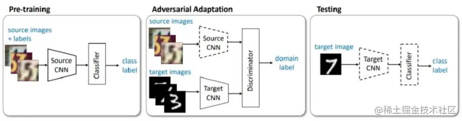 特征迁移希望算法模型学习到从源域到目标域不变的特征。一种方法是通过最大化域混淆损失使得算法模型分不清数据是来自源域还是目标域。另一种方法是基于对抗学习,下图是基于对抗学习的经典方法[3]:首先在源域上进行监督学习的训练。然后使用源域和目标域的无标签数据训练判别器,对数据进行二分类(是来源于源域还是目标域)。最后通过使用第二步中对目标域数据的特征提取器,即可以实现对于目标域数据的分类任务。