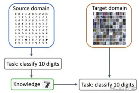迁移学习(transfer learning)是解决分布迁移问题的有效手段。下图阐述了其思路,左侧蓝框代表源域(Source domain),指大量有标数据的数据集,如MNIST数据集;右侧橙框代表目标域(Target domain),即研究关注的存在大量无标数据的数据集, 如SVHN数据集。此处任务(Task)是在SVHN数据集上的10分类问题。迁移学习的思路是算法模型通过在源域数据集上训练(手写数字数据MNIST的10分类问题)得到的可用知识,去解决目标域的问题(门牌号码数据SVHN的10分类问题)。