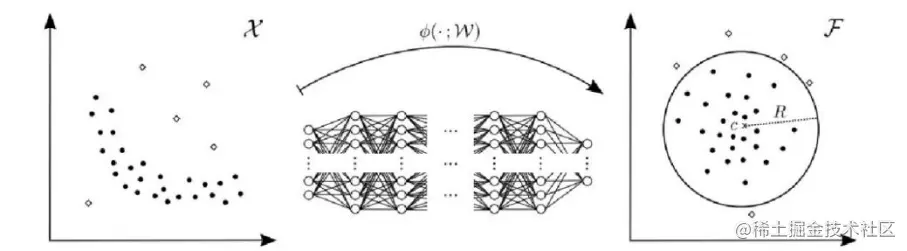 One class classification[5]训练算法学习可包围住正常数据分布的最小超平面/超球面。 下图的神经网络通过非线性变换将原始数据映射到特征空间中,算法在此特征空间中学习上述超平面/超球面;在测试阶段通过计算数据与上述模型的距离来判定该数据是否异常。