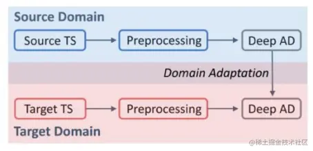 目前对于分布迁移下深度学习时间序列异常的检测研究较为有限。下图的研究思路中,首先对源域和目标域的数据进行预处理,随后在预处理后的源域数据上进行基于深度学习异常检测算法的训练,取得满意效果后,探究利用迁移学习方法把上述知识迁移到目标域的可行方案。