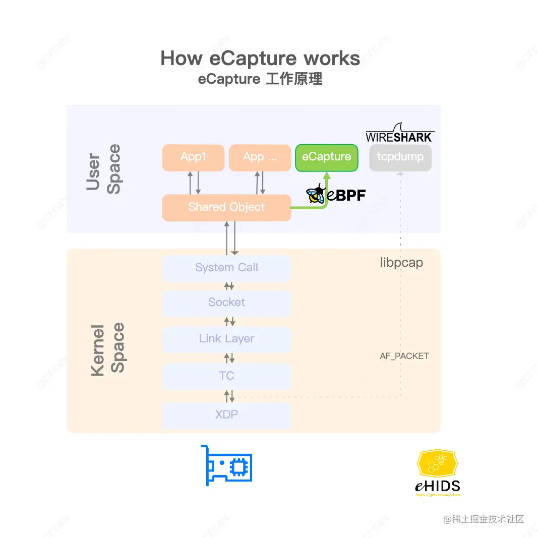 eCapture 是使用 eBPF 实现的抓包工具,无需导入CA证书即可抓取 HTTPS 通信的明文数据。