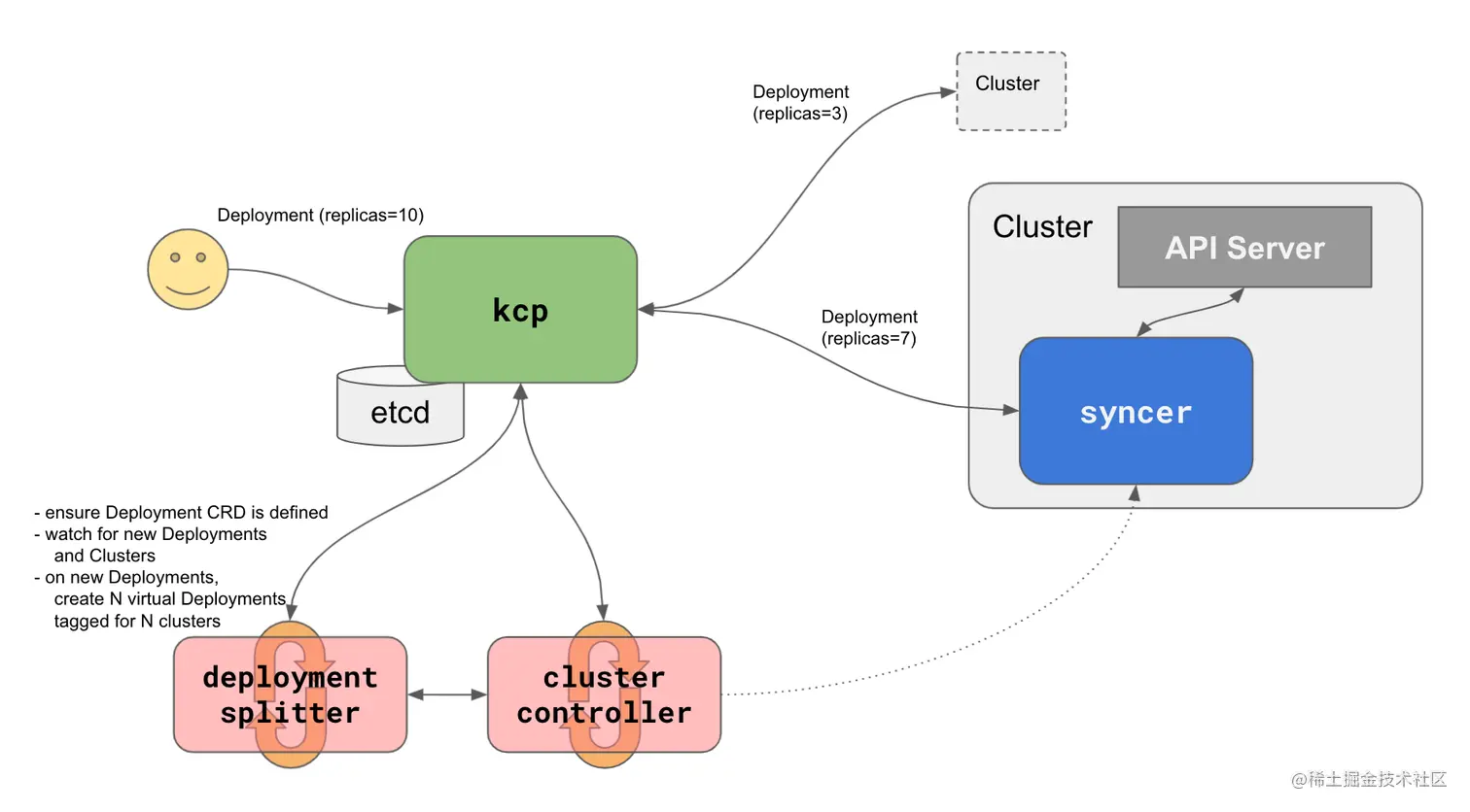Kcp 是 Kubernetes 多集群管理与调度的另一种实现形式,可以帮助用户将应用从一个集群无缝迁移到另一个集群。