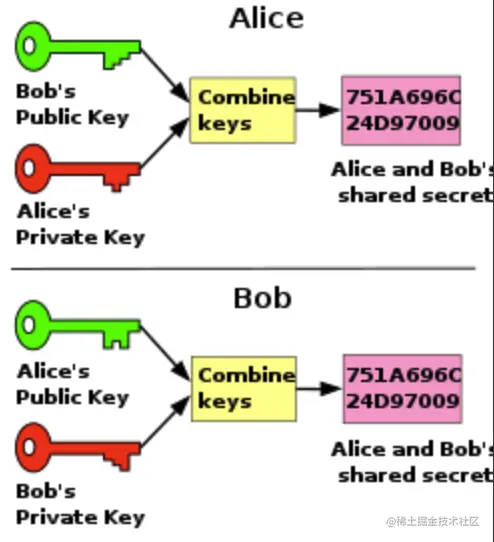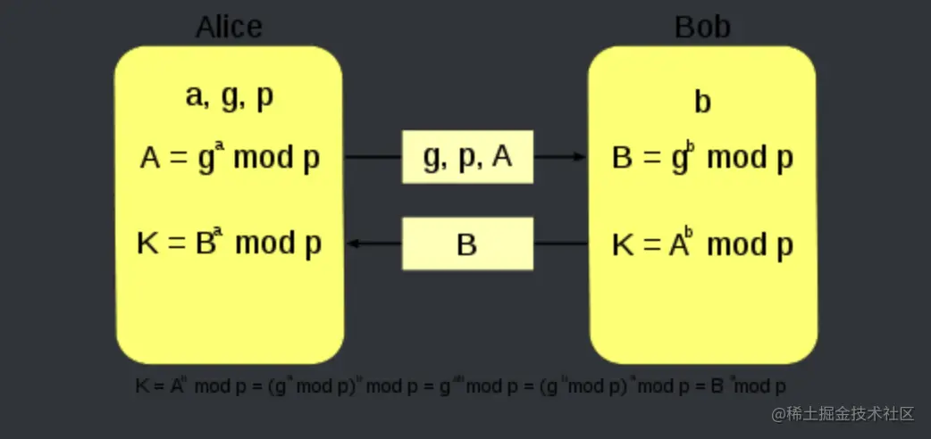 由上面的流程可以看到,Alice和Bob最终都得到了同样的值,因为在模p的情况下相等。注意是秘密的。
