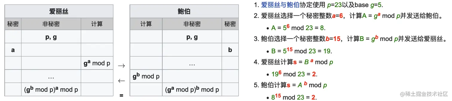 最简单,最早提出的这个协议使用一个质数p的整数模n乘法群以及其原根g。下面展示这个算法,绿色表示非秘密信息,红色粗体表示秘密信息: