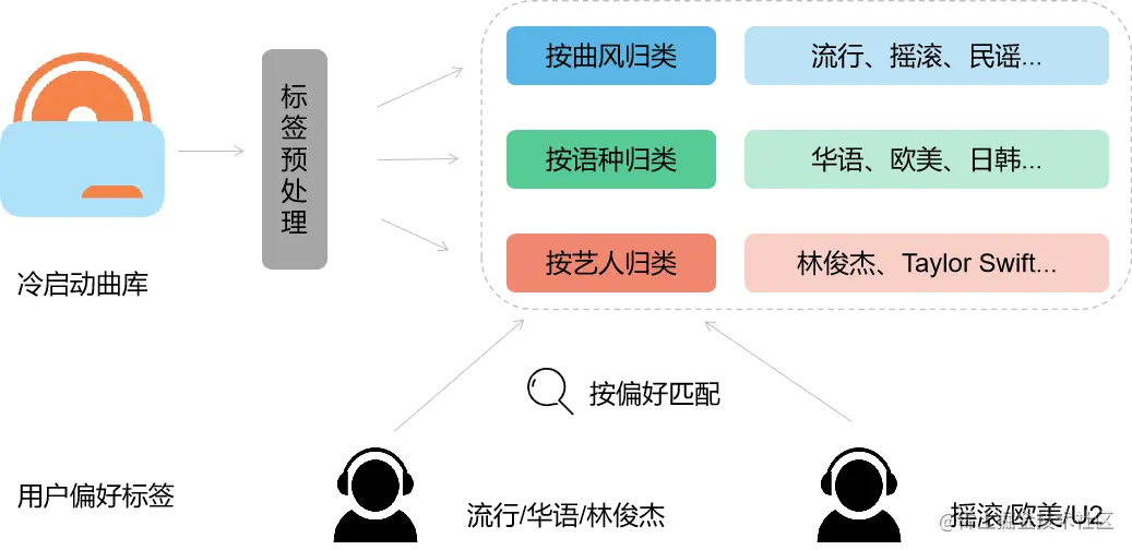 下面将从冷启动歌曲召回和冷启动歌曲的排序两个角度分别介绍基于内容标签的冷启动方案。