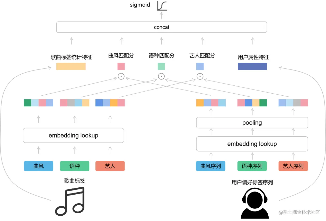 排序模型:该部分对用户曲风,语种和艺人三个维度的向量进行内积计算匹配分,然后加上歌曲标签维度统计特征以及用户维度属性特征输入逻辑回归模型预测用户是否。模型的训练时在用户对非冷启动歌曲的交互样本上进行,训练完成后得到每个的权重输出。