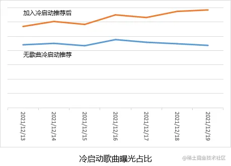 下图对比了线上实验情况,加入冷启动推荐的召回和排序作为实验组,无冷启动推荐作为基准组的实验效果。实验期间在不影响现有歌曲推荐系统用户体验指标前提下,加入歌曲冷启动系统的实验组相比基准组的冷启动歌曲曝光覆盖率取得了相对增加40%以上明显提升。