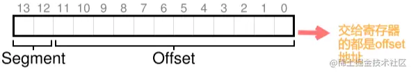 更加举例的来说,对于某一个地址空间的地址访问,我们可以将看作如下图所示,前两位是用于区分在作用在哪一个段上,后面是相对于寄存器值的偏移量。