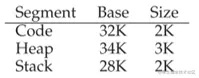 我们以一个实际的例子来看segmentation的工作流程,系统切换到某一个进程时,将其三个段的寄存器值填入,举例来说,可以是如下图所示,之后进程中的每一个内存访问都会通过这些寄存器分到不同的物理地址上。