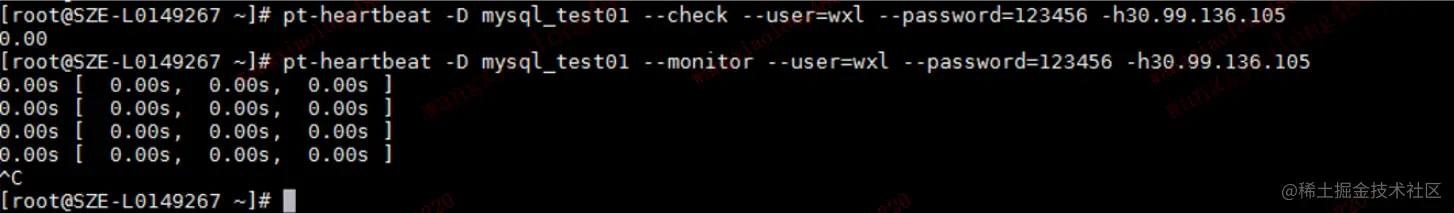 一直执行不退出:pt-heartbeat -D mysql_test01 --monitor --user=wxl --password=123456 -h30.99.136.105