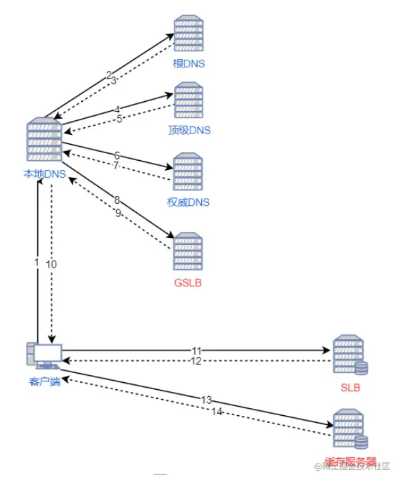 - 本地 dns 向 GSLB 发送请求。GSLB 根据本地 dns 的 ip 地址推测其地理位置,找出这个位置里最佳的本地负载均衡系统(SLB),并将 SLB 的 ip 地址返回给本地 dns