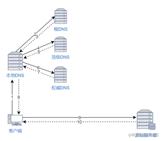 迭代查询如下图所示。查询主体始终是 本地DNS,所有的请求都由它发出,其它的 DNS 只是告诉它要向谁发送请求。