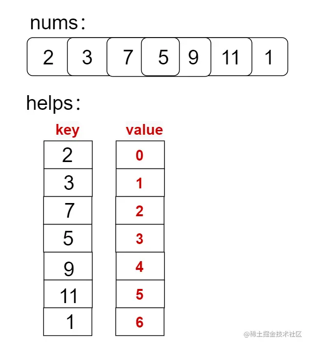 根据上面这个例图,例如,我们需要查询数字 7 ,通过 helps[7] 我们就知道,7 这个数字是否存在,并且还可以得到这个数字在 nums 数组中的索引 是 2