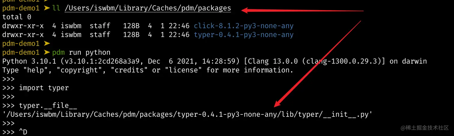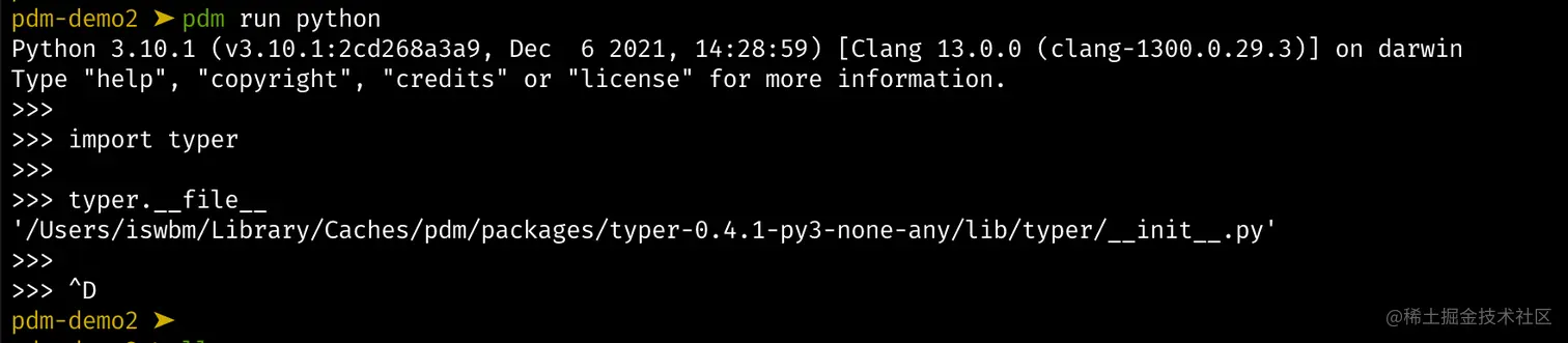可以发现,导入的 typer 与之前 pdm-demo1 的路径一致,说明这两个项目用的同一个 typer 包,避免了同个包同个版本的重复安装。