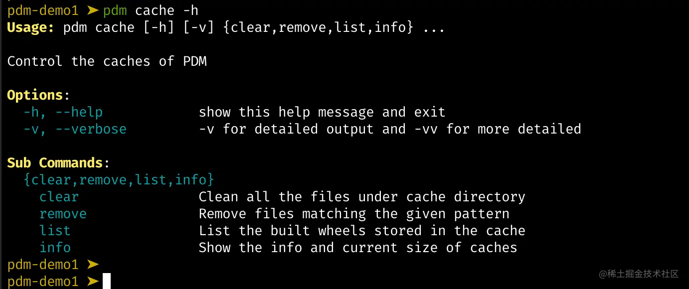 pdm 管理缓存的命令帮助如下