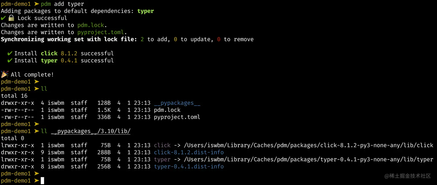 然后进入 pdm-demo2 下,同样安装 typer 包