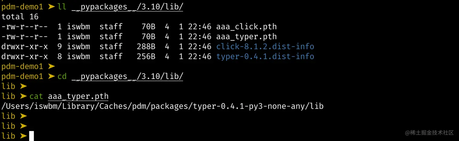 焦点回到 pdm 中来,如果你使用 cache_method=pth 的模式,你每安装一个包,在你的本地包目录下就会生成一个 .pth 文件,里面记录要缓存的包的 lib 目录。