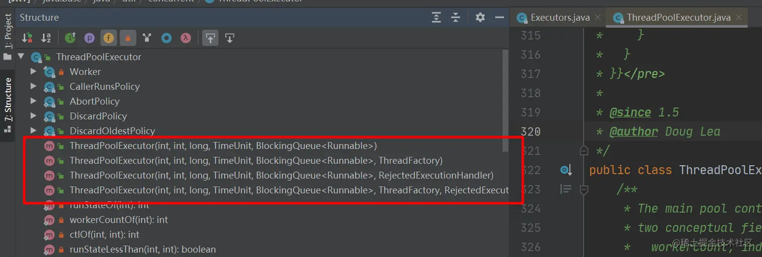 ThreadPoolExecutor 有四个构造方法,前三个都是基于第四个实现。第四个构造方法定义如下