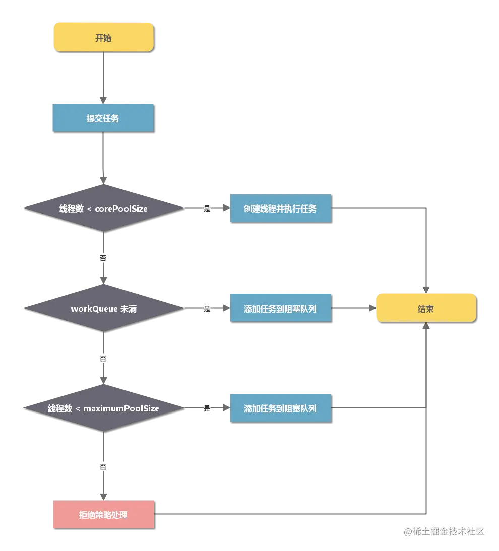 - corePoolSize - 核心线程数量。当有新任务通过 execute 方法提交时 ,线程池会执行以下判断: