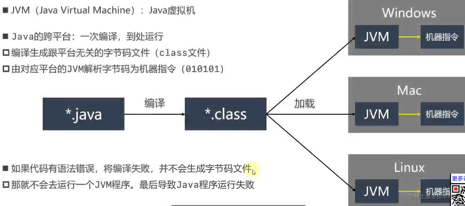 “一次编译,到处运行”是它的核心原理,你在Windows上编译出来的字节码文件,在IOS系统中也可以之后通过JVM翻译 成机器指令后执行