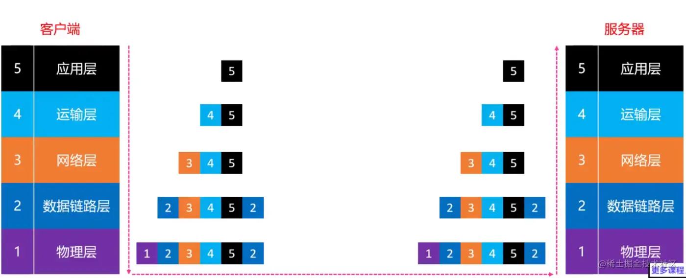 相反,服务器发送响应数据给客户端时,响应数据也会按照应用层、运输层、网络层、数据链路层、物理层的顺序对原始数据做一层封装,到达客户端之后,再按照相反的数据进行解析,直到应用层拿到了数据为止