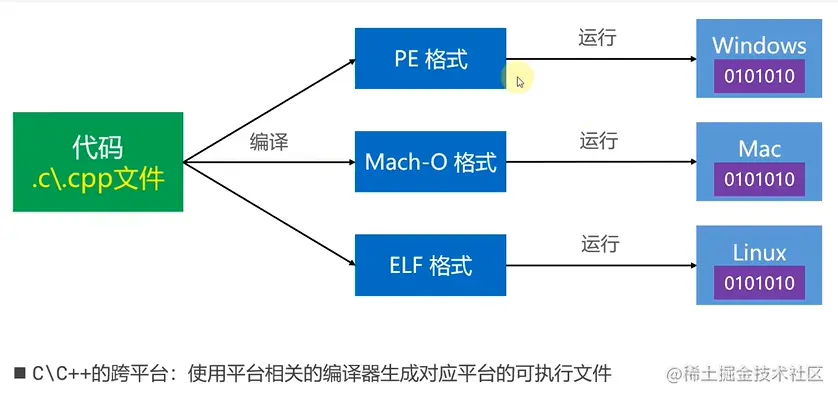 C/C++的跨平台原理就是使用平台相关的编译器生成对应平台的可执行文件,所以针对不同的平台编译出来的文件也都不同