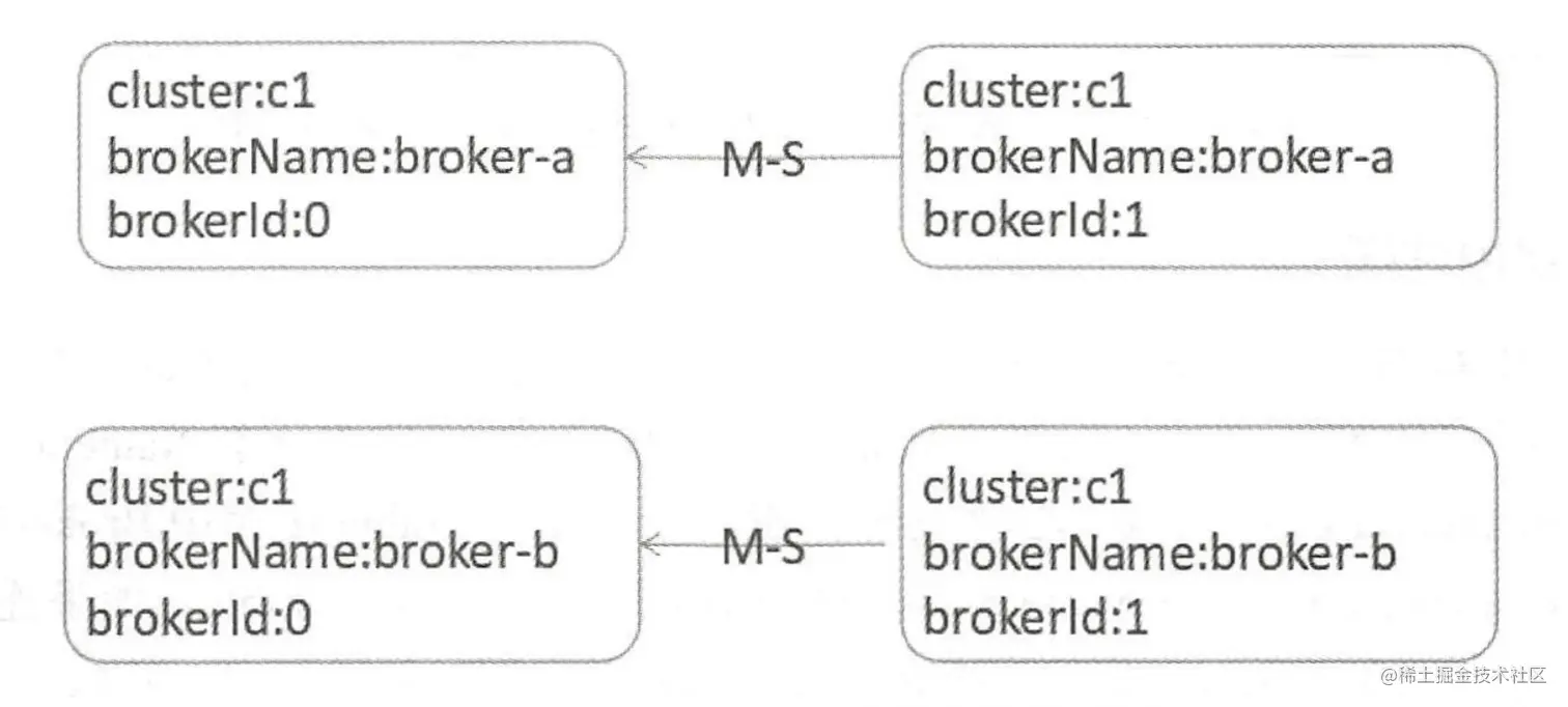 假设此时的RocketMQ部署架构为 2主2从,如下图所示 brokerId为0表示master,brokerID为1表示slave: