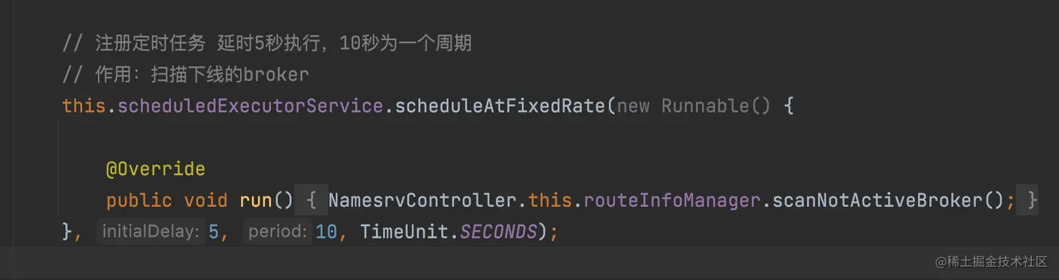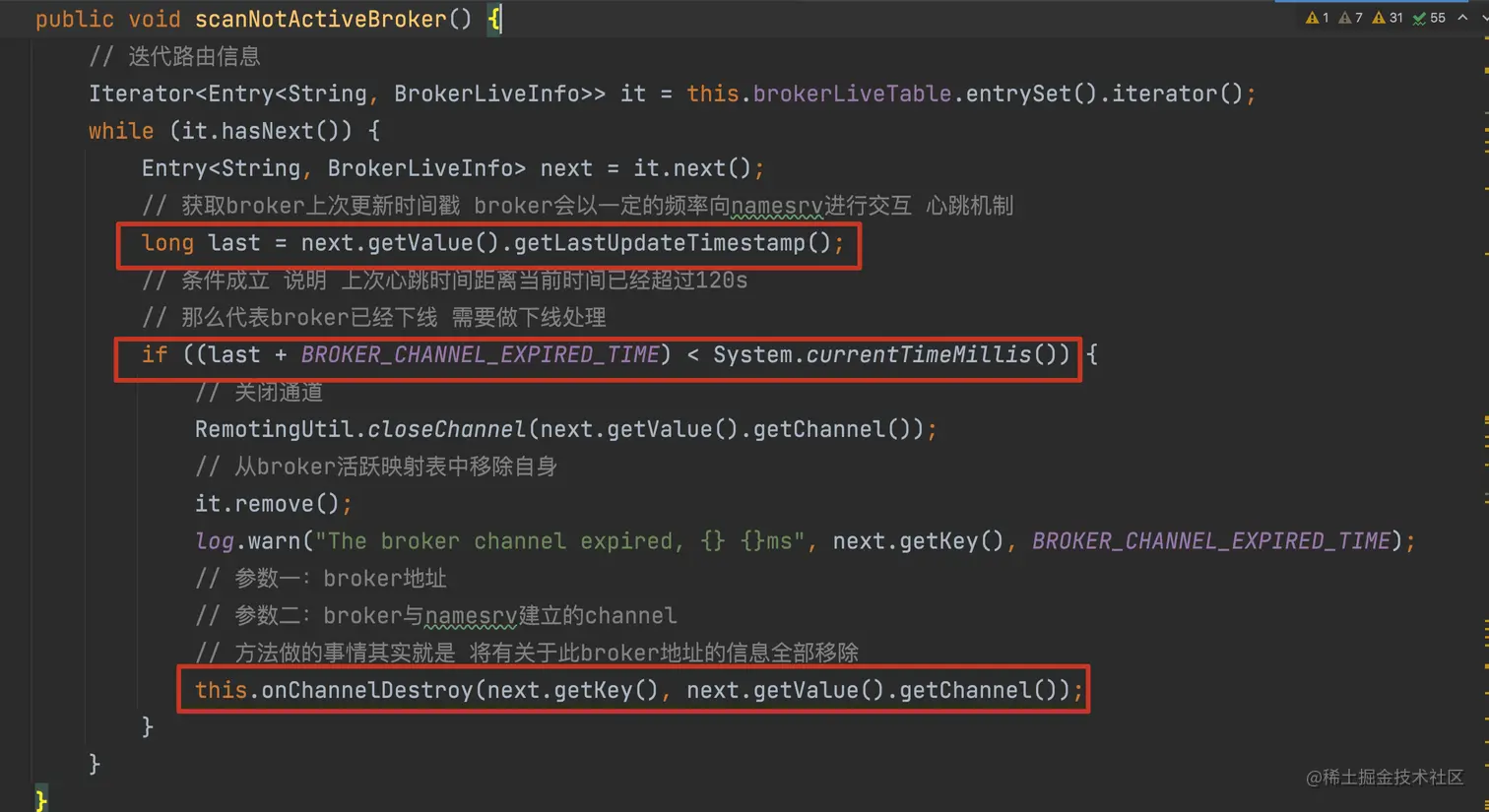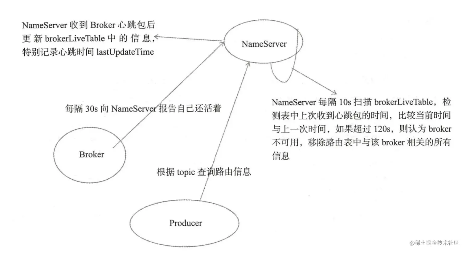 // 3. Namesrv实现了应用层的心跳机制 用于处理Broker下线问题