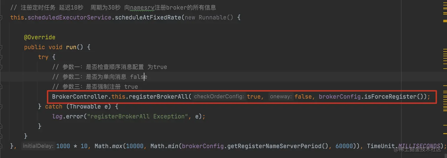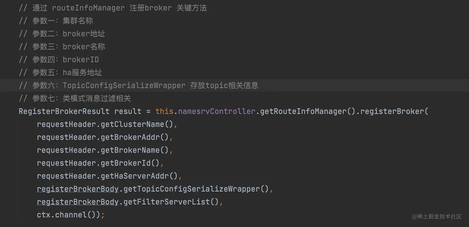 此方法其实就是broker向NameServer集群去发送心跳包,包的一些内容,网络交互的一些细节我们后续会讲,主要是会发送一些关于当前broker的一些信息以及管理的topic信息。这里Broker与NameServer具体是如何交互的我们后续会详细讲解,这里大家只需要知道发送的时候消息头会携带一个code码,根据code码可以可以知晓本次操作是