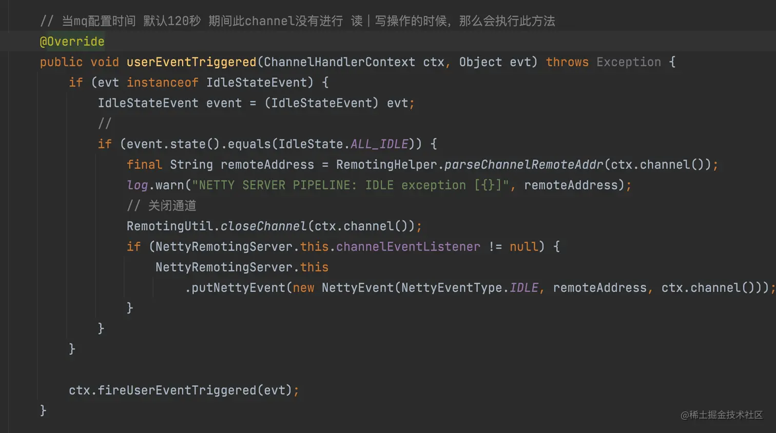 通过Netty提供的 IdleStateHandler 类,用于提供心跳机制的,简单来说,就是当 指定的时间内 channel 没有传递数据的话,IdleStateHandler 会通过 pipeline 传播 userEventTriggered()方法,并且内容类型为具体的 IdleStateEvent,RocektMQ提供的ChannelHandler对象监听userEventTriggered()方法,然后进行关闭通道。
