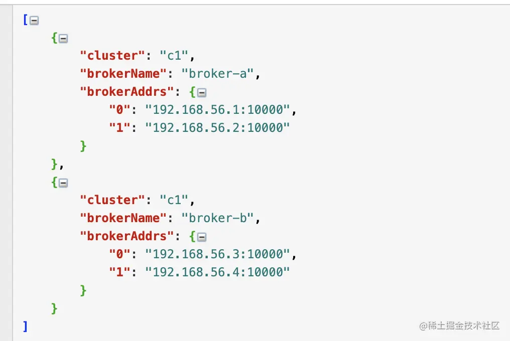 - brokerAddrTable:key为broker名称,value为Broker基础信息。包含 brokerName、所属集群名称,brokerName下的master节点的id、ip地址,slave节点的id、ip地址。