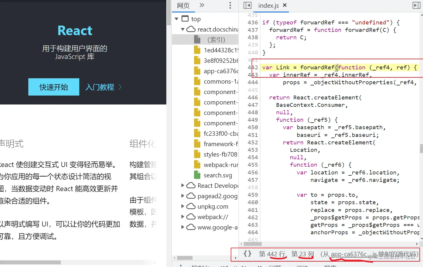 好家伙,这和笔者想做的跟踪文件位置已经很接近了,不仅如此,注意下方“第442行,第23列 (从xxx.js)”映射到源代码,说明这个功能可能还有获取行,列,文件位置的能力