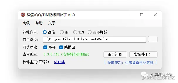 适用于 Windows 下 PC 版微信/QQ/TIM的防撤回补丁。支持最新版微信/QQ/TIM,其中微信能够选择安装多开功能。